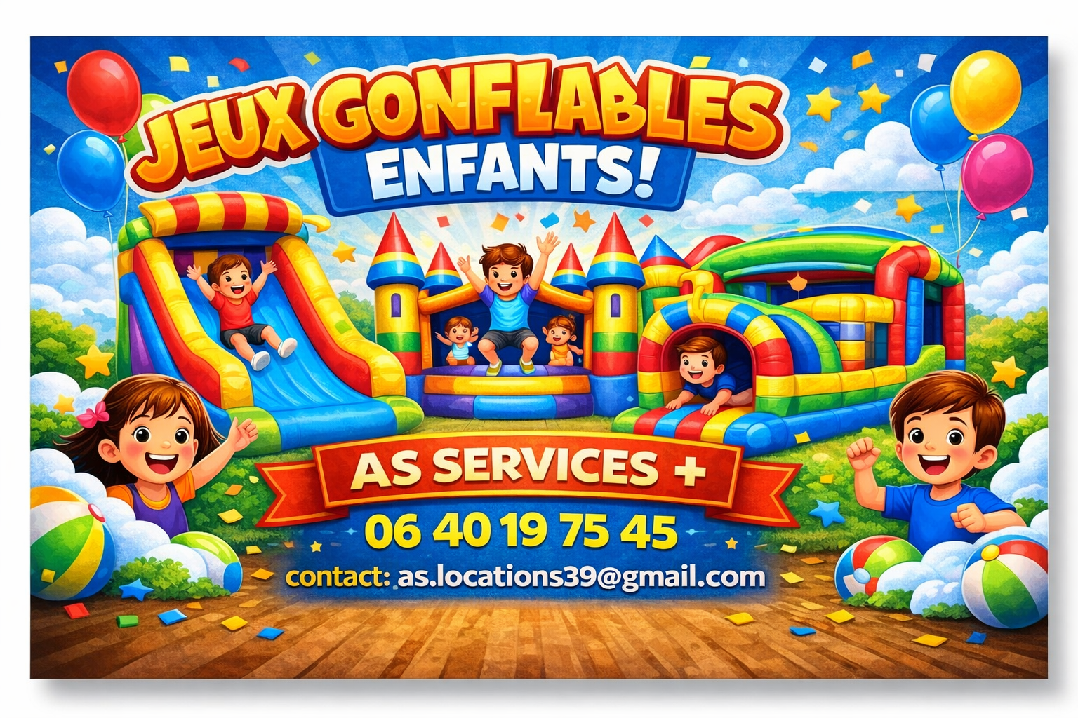 Que ce soit pour un anniversaire mémorable, une kermesse d'école ou une fête de quartier, AS SERVICES + est là pour vous aider. Nous nous occupons de la livraison, de l'installation et du démontage de nos jeux gonflables, vous permettant de profiter pleinement de votre événement sans souci. Offrez aux enfants une expérience unique et inoubliable avec nos structures sécurisées et divertissantes.